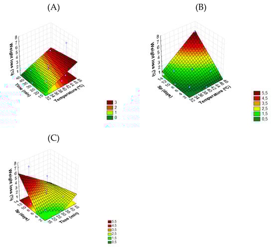 Response surface 3D contour plot indicating the effects of (A) temperature (T, °C) and time (t, min), (B) temperature (T, °C) and storage period (Sp, days), and (C) time (t, min) and storage period (Sp, days) on weight loss (%) of tomato fruit.