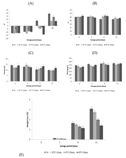 After the thermosonication treatments, a reduction on tomato TPC was observed, with the conditions of 32 °C during 13 min and 40 °C during 30 min conducting the lower reduction on this parameter, 5% and 8%, respectively, compared with Ctr samples (243 mg kg−1) (Figure 5D). During storage an increase of TPC was observed, whereas the TS-treated samples at 35 °C during 20 min and 40 °C during 30 min reveal the highest content at the end of storage: 26% and 22%, respectively. The weight loss (WL) of all samples increased during storage at 10 °C (Figure 5E). After day 15, the samples treated with TS showed the lowest WL compared to Ctr samples, whereas the 40 °C during 30 min denoted only a loss of 1.4%.