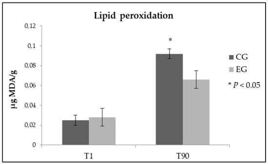 Diet enrichment with zinc did not induce alterations of the oxidative stability in samples of fresh cheese (Figure 1). Very interesting is instead the result obtained after 90 days from the cheese making, as expected lipid peroxidation increased in all the analyzed samples, but in ewes’ milk cheese obtained from EG the value of malondialdehyde was stood at significantly lower values if compared to samples of the control group (0.092 vs 0.066 µg MDA/g of cheese, in CG and EG respectively; p < 0.05).
