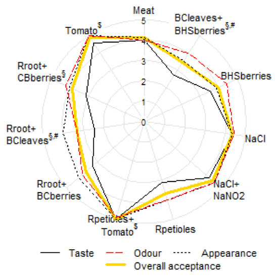 The highest taste scores were obtained for Rpetioles+tomato, tomato, and NaCl+NaNO2 treatments, and the lowest scores for Rroot+blackcurrant(BC)leaves, BCleaves+blue honeysuckle(BHS)berries, and Rpetioles (Figure 1). While some of the panelists found the cooked minced pork (control) tasteless, others even preferred that taste. The treatment with 1% of salt was generally perceived as very pleasant, but some panelists would have preferred even less salt. The color of both the control and the meat with salt was pale pink and was regarded as characteristic of minced meat. The NaCl+NaNO2 treatment was described as very pleasantly pink-colored, and its taste was evaluated similarly to that of the treatment with salt. In the Rroot+BCberries treatment, yellow and purple colors were mixed, which deemed pleasant to the panelists, whereas the taste was perceived as bitter-sour by some evaluators, though it was generally well acceptable. The addition of rhubarb root together with blackcurrant leaves was evaluated as sour, spicy, and herbal, characteristic of the vine leaf dolma (from the Mediterranean cuisine); the odor was characterized as herbal. The treatment with Rroot+CBberry was characterized by a pleasant taste. The addition of blackcurrant leaves together with blue honeysuckle berries was again characterized as the taste of dolma; however, for some of the panelists the taste, color, and odor were slightly unpleasant. BHSberries treatment had too sour taste and odor, and the purple color seemed too intense. Likewise, the addition of 2% rhubarb petioles tasted too sour. All berry powder treatments resulted in a purple color, which was not as well liked as the yellow-orange-golden color that was obtained with the addition of rhubarb root or tomato. The panelists rated the treatments with blackcurrant leaves as those with the least pleasant taste and odor and the lowest overall acceptance. The green color was regarded as less likeable. If plant powders will be used in production, the customers need to be trained to expect a purple or green color in meat products.