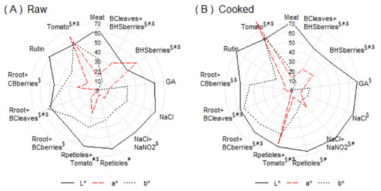 Changes in the color of the raw (A) and cooked (B) meat samples of subjected to different treatments; superscripts §, $, and # denote treatments with statistically significant difference from untreated meat in L*, a*, and b*, respectively. For better visual clarity, the redness (a*) and yellowness (b*) values were multiplied by four and two, respectively.