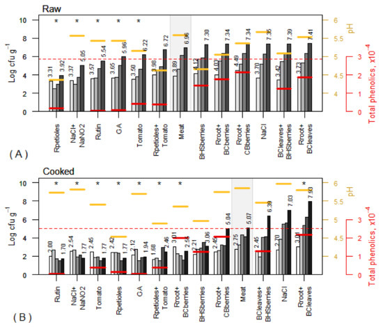 Total microbial counts (columns) of raw and cooked samples subjected to different treatments after storage times of 0, 2, 4, 6 (raw) (A) and 0, 2, 4, 6, 8 days (cooked) (B). The short horizontal lines (settled according to the secondary vertical axis) show the average pH and total phenolic contents (TPC) over storage times (standard errors for pH vary in interval 0.01–0.05, and those for TPC in the interval 0.00–0.05 × 104). The treatments are ordered according to the value on the last storage day, separately for raw and cooked samples. The values on the first and the last day are presented numerically; control (meat) samples are marked with a grey background, and the stars (*) denote the treatments with a statistically significant difference with respect to control (meat) for the average level of microbial counts over storage times (p < 0.05, Dunnett’post-hoc test). The dotted lines denote the acceptable limits of total microbial counts on the last day of storage in the raw (5.69 log cfu·g−1) and cooked (5.0 log cfu·g−1) meat, respectively. Abbreviations are presented in Table 1.