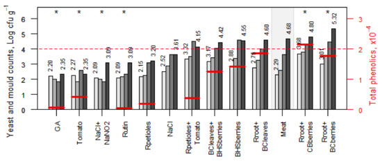 Yeast and mold counts (columns) and TPC (short horizontal lines, in arbitrary units; the standard errors for TPC vary in interval 0.00–0.05 × 104) of raw minced pork samples subjected to different treatments after storage time of 0, 2, 4, 6 days. The dotted line denotes the acceptable limit of yeast and molds on the last day of storage. Treatments are ordered according to the value on the last storage day; the values on the first and the last day are presented numerically; control (meat) is marked with a grey background, and the stars (*) denote the treatments with a statistically significant difference from control for an average level of yeast and mold counts over storage times (p < 0.05, Dunnett’ post-hoc test). Abbreviations are presented in Table 1.