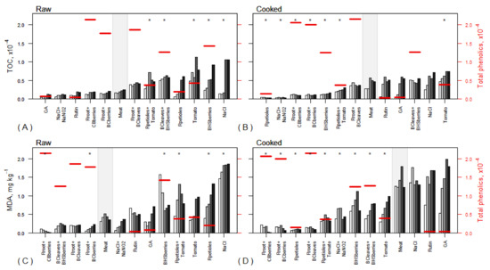 Due to the different mechanisms of their antioxidant effects, the plant powders used in the present work behaved differently in the raw (Figure 5A,C) and cooked (Figure 5B,D) samples. While various enzymatic and chemical mechanisms are usually competing with each other in raw meats, the enzymatic routes of PUFAs oxidation are excluded in cooked samples. In the first case, inhibitors of oxidation enzymes (lipoxygenases, cyclooxygenases, CYP450), as well as free-radical scavengers, ferric ion sequesterers, etc., have their role in the extremely complicated antioxidant effect of plant mixtures. The values of the TOC, MDA, and TPC in the raw and cooked samples are presented in Figure 5.