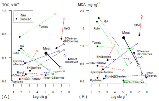 Association between the content of (A) TOC and (B) MDA and total microbial counts (Log cfu·g−1) in raw and cooked minced pork on the last storage day, depending on the treatment. Each dot marks the average values of raw and cooked minced pork samples corresponding to the same treatment and is joined with a line (shorter lines indicate higher similarity between raw and cooked minced pork samples for that treatment). Control (meat) samples are denoted with bigger symbols; for other treatments, different line styles and colors are used to facilitate their distinction (same line styles and colors are used for the same treatments in Figure 6A,B). Abbreviations are presented in Table 1.