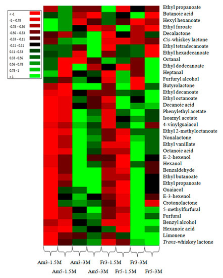 The minor volatile profile of the American and French oak chips data set was used to generate a heat map representation (Figure 1) for a rapid visual assessment of the similarities and differences between wine samples. Certainly, visible changes in volatile compounds correlated with ageing process were observed, suggesting that the wines treated with oak chips had different profiles. During ageing, specific compounds are transferred into wines as a result of the long contact with the oak chips. Two dosages of American and French oak chips were used (3 and 5 g/L), and the allowed contact time was of 1.5 and 3 months. As a consequence, each sample of wine evolved in a different manner, with visible increases of the volatile compounds in wines aged 3 months with either American or French oak chips.
