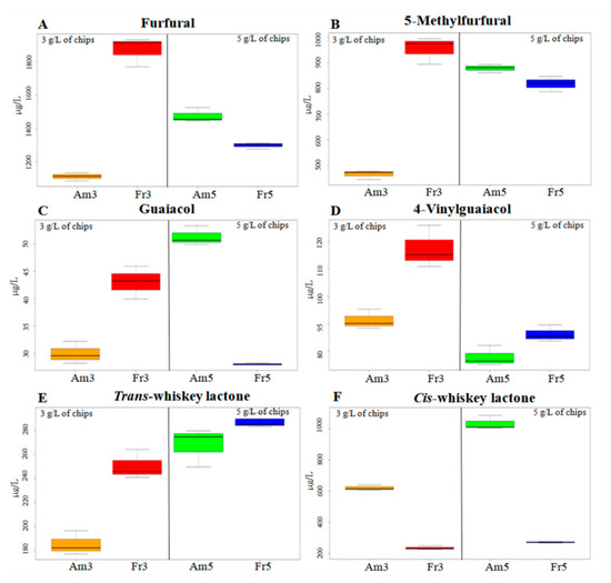 Furfural had the highest median and values in wines treated with French oak chips compared to those treated with American oak chips in the case of the treatment with 3 g/L of chips, while it presented the lowest median for the treatment with 5 g/L oak chips. The compound 5-methylfurfural presented the same behavior as furfural. Thus, both compounds increased in samples treated with French oak chips at 3 g/L and decreased when used 5 g/L of chips was used. In wines treated with American oak chips, these compounds showed a different trend when compared with those observed for wines treated with French oak chips (Figure 2A,B). As previously found [46], furfural and 5-methylfurfural levels were higher in French oak chip-treated samples also in or study.