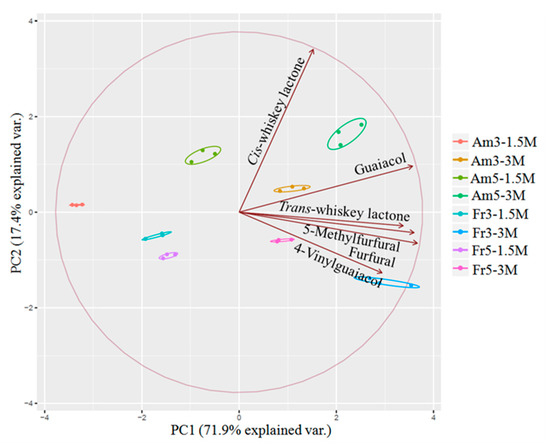 PCA is one of the multivariate statistical analysis methods that are used intensely in the food and beverage area and is useful to decrease data dimensionality, while keeping patterns. In this research, PCA (Figure 3) was used to examine aged wines with two types of oak chips (American and French), two dosages of oak chips (3 g/L and 5 g/L), and two different ageing times (1.5 and 3 months). Furthermore, PCA was used to investigate the contribution of specific aroma compounds to each principal component. As it can be observed from Figure 3, the first principal component (PC1), accounting for 71.9% of the total variance, relates to the increase in compound intensity with increased ageing time. PC1 led to the separation of the samples treated with American and French oak chips between those aged for 1.5 months and those aged 3 months, since the samples aged for 3 months in the presence of American and French oak chips were grouped on the positive side of PC1, while the samples aged for 1.5 months were located on the negative side of PC1. The second principal component (PC2) accounted for 17.4% of the variation, separating samples high in cis-whiskey lactone from those high in 4-vinylguaiacol and furfural. Furthermore, PC2 contributed to the differentiation of wines aged with American oak chips from those aged with French oak chips. Samples aged for 1.5 months with French oak chips were located on the negative side of PC2, whereas the American oak chip-treated samples were located on the positive side. The principal component analysis shows that the French oak chips aged for 1.5 months have similar wine flavor profiles; in contrast, clear differences were observed when the wines were aged for 3 months.