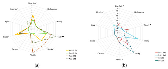 Specific aroma descriptors were used: ripe fruit, herbaceous, woody, toasty, smoky, vanilla, caramel, cacao, spice, and licorice. The tasters graded each specific aroma descriptor with a score from 1 to 5 (1—detectable, 2—weakly perceptible, 3—moderately perceptible, 4—strongly perceptible, and 5—very perceptible) in increasing order of perceived intensity.