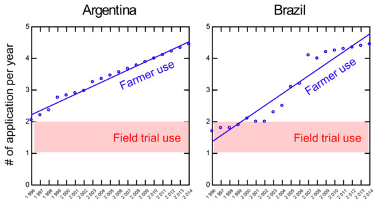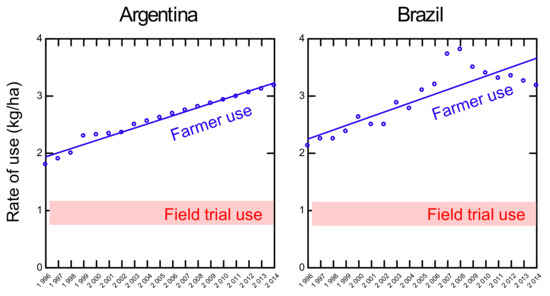Official statistics show that the rates of glyphosate/GBH use in Argentina and Brazil, two of the dominant countries for soy production, have increased significantly from 1996 to 2014 with an almost perfect linear fit (R2 = 0.98 and 0.91 respectively, p < 0.0001, linear regression), reaching 3–4 kg/ha (active ingredient of glyphosate, hereafter termed a.i.) in later years (Figure 1). Thus, these farmer rates are more than twice as high as the recommended doses used in most field trials, i.e., 1.72 kg/ha [18].