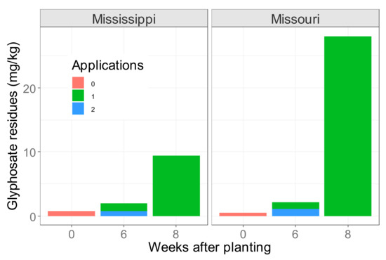 Published data from field trial tests show that the uptake of glyphosate in soybean is highly dependent on the timing of herbicide applications. While plants sprayed once or twice within six weeks after planting resulted in residue levels of less than 3 mg/kg, a single application at eight weeks, i.e., at full bloom of the plant, resulted in a 10–20-fold increase in residual concentrations (i.e., 9.45–28.08 mg of glyphosate per kg, Figure 3) [49]. Those results were consistent across field trial sites in Mississippi and Missouri respectively, and suggest that high residue levels of glyphosate in soybeans come from late season spraying. This makes sense since glyphosate is a systemic herbicide that circulates in the plant and may thus be incorporated into metabolic sinks, such as actively growing soybeans in the treated plants.