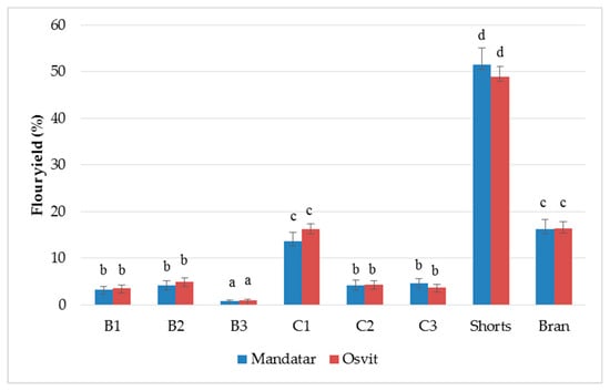 Milling products are often qualified according to their ash and grain protein content. They are important quality control parameters in the milling industry applicable to final flour products before putting them on the market. Based on literature findings, it is often assumed that barley bran, like wheat bran, consists of testa and pericarp, germ, aleurone, and the subaleurone layers. Barley bran is found to be brittle and difficult to separate from the endosperm by roller milling and, therefore, it increases the ash content and darkness of barley flour [40]. Results of the chemical composition of the different milling fractions showed that ash and protein contents were unevenly distributed along barley kernel (Table 1). Ash and protein content increased more from the endosperm fractions (B1–B3 and C1–C3) toward shorts and bran, while starch content decreased. Ash varied from 0.82% (B3, Mandatar) to 3.10% (Bran, Osvit). Protein content was the highest in the shorts (14.80%, Mandatar and 14.27%, Osvit) and bran (17.87, Mandatar and 17.6%, Osvit) (Figure 2), while starch content was the lowest in bran (48.69%, Mandatar) and the highest in the B3 fraction (82.31%, Mandatar and 81.90%, Osvit) (Table 1). The inverse distribution of chemical components obtained along the kernel parts of hull-less barley was confirmed by Andersson et al. [29].