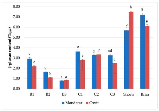 β-glucans (%) content in break (B1–B3), reduction (C1–C3), shorts and brans of hull-less barley. Different letters above columns of each cultivar indicate significant differences, Fisher’s test (α = 0.05).