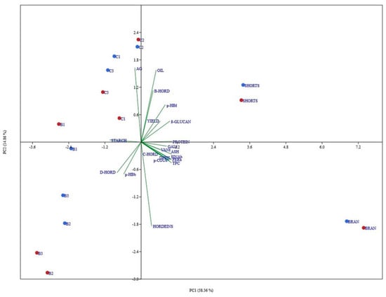 The results obtained from PCA are a summary of all features, and both evaluated hull-less barley varieties and give us additional information about the aim of this study. Principal component analysis (PCA) was chosen to test whether the observed differences in milling fractions were genotype-specific and to what extent, and also to see the correlation of the above-mentioned fractions towards measured parameters. The first two PCs explained 73.22% variation present in the dataset (Figure 5). Shorts fraction for both varieties was present in the first quadrant, positive in both principal components, mostly correlated with flour yield, protein content, β-glucan content, etc. Also, trait-specific and varietal grouping was observed among other flour fractions, where Bran is grouped in the fourth quadrant, B fractions in third, and the C fractions in the second. PC analysis revealed a clear connection between different flour fractions and specific traits (green vectors), whereas this fact alone further affirms the logic behind univariate results mentioned before. Parameters of antioxidant activity (free and bound phenolic acids, TPC; DPPH) correlate positively with ash, proteins, and C-HORD and negatively with starch. The position of B glucan is expected given the chemical parameters, but it is interesting to note the positive correlation of this property with the antioxidant parameters and negative relation with D-HORD.