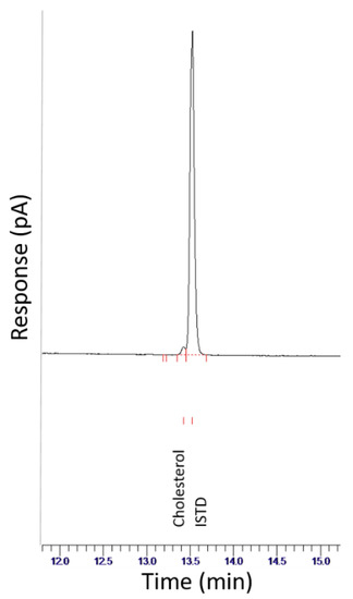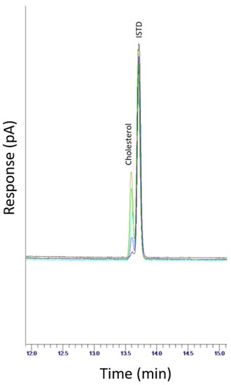 The official gas chromatographic (GC) method used for cholesterol determination in foods is the Association of Official Analytical Chemists (AOAC) 994.10 [3]. Many analysts consider this method to be lengthy and labour intensive as a result of the large amount of chemicals needed, the complexity of the method, and the several preparatory steps needed before GC analysis [4]. For these reasons, many authors have developed their own methods for cholesterol determination in meat and other food matrices since the publication of AOAC 994.10 [4,5,6]. However, the majority of the methods developed for meat and other foods rely on external calibration rather than internal standards for quantification purposes. For example, no publications to date have used relative response factors (RRFs) to validate GC cholesterol methods, although the use of RRFs has some advantages over traditional methods relying on calibration curves. The response factors of compounds in GC can vary from one day to another and also from one instrument to another [7]. To be able to consider these variations, an external calibration curve is usually produced for each run. However, RRFs are not affected by day to day variations (i.e., are constant) and there is no need to run a calibration curve with every run.