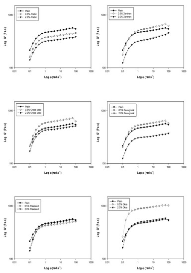 Plots of log G′ versus log ω of chickpea starch gum blends at different gum concentrations.