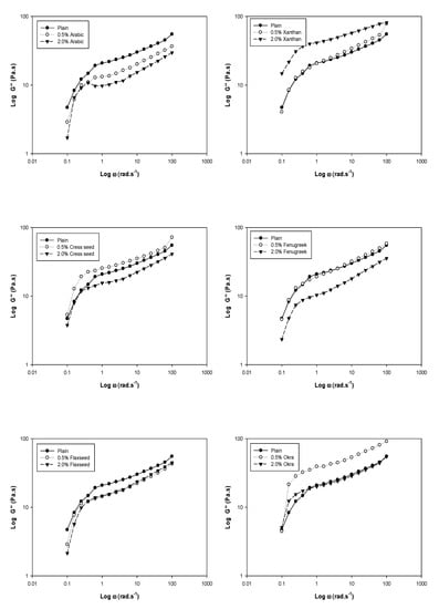 Plots of log G″ versus log ω of chickpea starch gum blends at different gum concentrations.