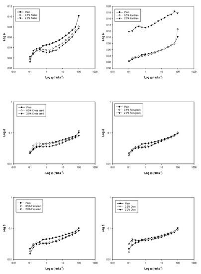 Plots of logδ versus log ω of chickpea starch gum blends at different gum concentrations.