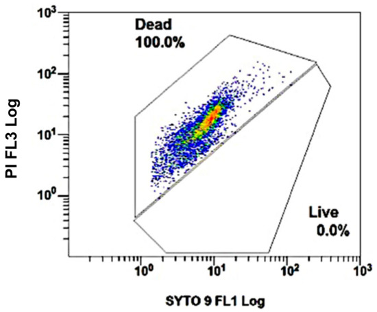 Cell suspensions were stained using the Live/Dead BacLight Bacterial Viability and Counting Kit (Molecular Probes, Invitrogen, CO, USA) according to the manufacturer’s instructions as follows: 10 µL of the bacterial cell suspension, 987 µL of 0.85% NaCl, 1.5 µL of 3.34 mM SYTO9 green fluorescent nucleic acid stain, and 1.5 µL of 30 mM propidium iodide (PI) red fluorescent nucleic acid stain were dispensed into each FC tube. For accurate counting, the total volume in the FC tubes was 1000 µL. The final population of the microorganisms should be calculated taking into account the 100-fold dilution into the FC tubes. The tubes were incubated at room temperature for 15 min and were protected from light, as they were wrapped with aluminium foil and stored in a cabinet.