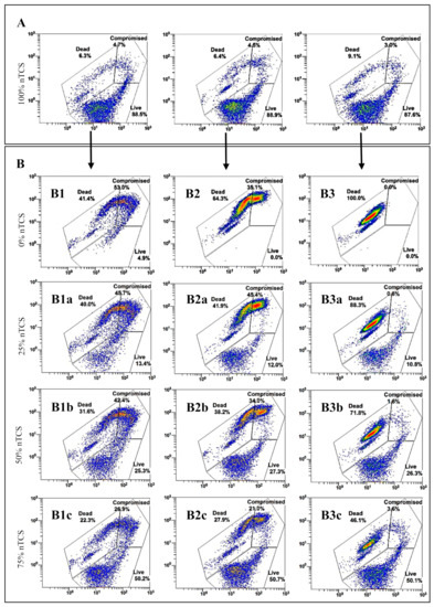 When the percentage of nTCS cells (live cells) was increased in the nTCS:TCS100 mixtures (Figure 2(B3a–c)), the number of CC slightly increased, showing that some of the live cells have compromised membranes—dead cells or TCS100 were detected in a well-defined area without a shift towards the CC’s area (Figure 2(B3)). The number of CC increased with cells coming from both nTCS and TCS65 areas in nTCS:TCS65 mixtures (Figure 2(B2a–c)). This CC’s rise was even more evident in the case of TCS60 in nTCS:TCS6o mixtures (Figure 2(B1a–c)).