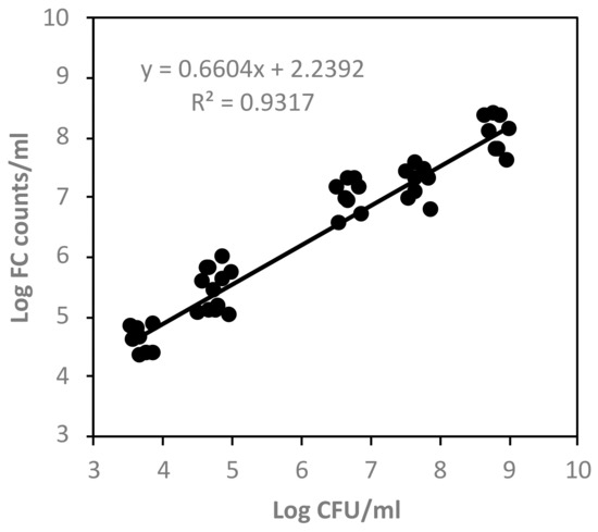 Correlations between the FC method and plate counts were calculated [44]. Different cell concentrations of C. sakazakii between 104 and 109 CFU/mL were analyzed using the FC and plate count method.