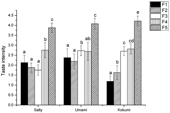 To further confirm the effect of kokumi taste of F5, the taste interaction between F5 and 1.0% sodium chloride or 0.5% MSG solution were investigated. One percent F5 was added to 1.0% sodium chloride and 0.5% MSG solution, respectively, so as to compare the changes of salty and umami intensity by sensory evaluation. The results showed that after F5 was added, salty intensity was improved from 1.9 to 2.6 and umami intensity was improved from 2.5 to 3.2, respectively, which was consistent with other results in the literature [3,16].