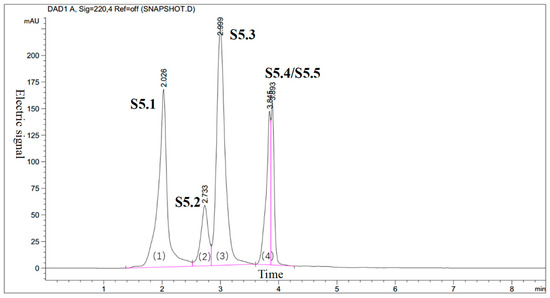 Reverse phase-high performance liquid chromatography (RP-HPLC) chromatogram of fraction F5 (five subfractions, S5.1–S5.5, were collected).