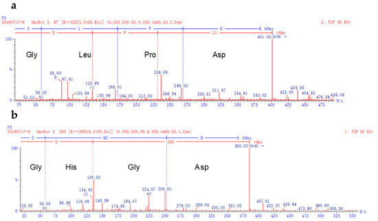 Liquid chromatography coupled quadruple time of flight mass spectrometry (LC-Q-TOF MS) spectrum (electrospray ionization (ESI+)) of the peptides Gly-Leu-Pro-Asp (a) and Gly-His-Gly-Asp (b) isolated from S5.1.