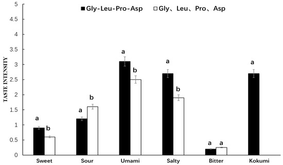 Sensory evaluation of peptide Gly-Leu-Pro-Asp and its mass-equivalent amino acids mixture in chicken broth. a, b The different letters in the same group represent that there are significant differences at the level of p < 0.05, and the same letters represent no significant difference.