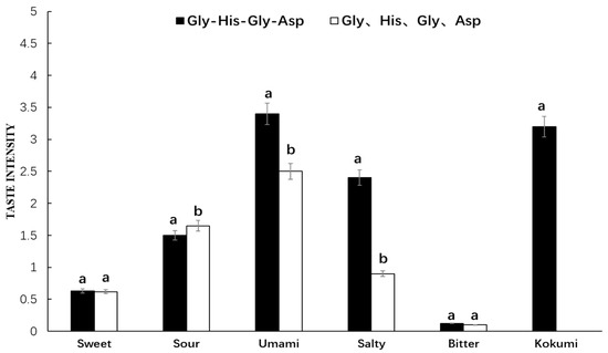 It was seen from Figure 6 that Gly-His-Gly-Asp showed a strong umami, salty, sour, and kokumi taste in chicken broth, while its amino acid mixture exhibited umami and sour taste without showing kokumi taste in chicken broth. This synthetic peptide and its amino acid mixture in chicken broth showed dramatically significant differences in umami and salty intensity. Furthermore, their sour intensity was high, while their bitter intensity was low, and they both showed certain sweetness in chicken broth with no significant difference. It was thus indicated that Gly-His-Gly-Asp in chicken broth with obvious kokumi taste was quite different from that in water. The taste characteristics of amino acid mixture in chicken broth were basically consistent with those in water.