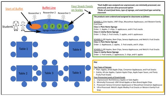 The four snack foods were compared with each classroom of students to capture all the levels of food processing and compare preferences when all the options were available to the research subjects [46,47,48]. Each student was assigned a number, which was written on their plate and bowl and then used to record and match the student selection, consumption, and survey results. The researchers handed materials to students and recorded the weight in grams on the scale for each snack food item as each student selected their portion. The students were told not to share their food and that they did not have to finish everything on their plates and in their bowls. Figure 1 summarizes the overall design and outline of the research setup.