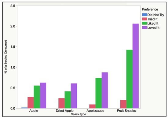 The Variation of Adolescent Snack Food Choices and Preferences along a Continuum of Processing Levels: The Case of Apples study was structured in such a way that it would address the gaps in research and provide new insight. As with the studies mentioned above, this study incorporates a taste test, plate waste data, hedonic rating for the taste of food items, and a variety of processed snack food products to make comparisons. Like the tortilla study mentioned above, it was found that the participants were drawn to highly processed food items and consumed more of them [59]. It was also found that the participants were drawn to snack food items that were more highly processed, which could have had to do with taste qualities associated with sugar, salt, and fats [54,60]. Therefore, this research builds upon prior research and expands the realm to include the following results.