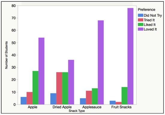 Since the students selected, consumed, and enjoyed minimally processed dried apple chips less than unprocessed apples, it is evident that they did not like the physical appearance or taste of dried apples when compared to unprocessed apples. Other factors that could have influenced the results include previous exposure to apples, fruit snacks, and applesauce. Dried apple chips are not as mainstream at grocery stores compared to the other options, therefore they might have been a new snack food to a lot of the students. Also, dried apples are relatively more expensive than the other apple snack foods, which may have influenced the amount of families who were able to purchase them for their children and expose them to the snacks on an earlier or regular basis.