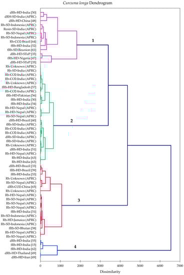 A hierarchical cluster analysis was carried out based on the C. longa essential oil compositions. For comparison, we included C. longa rhizome oils that were reported in the literature in this analysis, including 23 steam- or hydrodistilled essential oils and two supercritical CO2 extracts (Table 5). Although C. longa rhizome oils were all rich in ar-turmerone, α-turmerone, and β-turmerone, the cluster analysis revealed four clearly defined clusters based on the relative concentrations of these major components (Figure 1). The cluster centroids of the major components of C. longa rhizome oils are summarized in Table 6, illustrating the chemical differences in the four clusters. Cluster 2 was the largest, representing 21 samples dominated by the turmerones (particularly ar-turmerone). Cluster 1 represents samples with relatively large concentrations of components other than turmerones; therefore, lower concentrations of turmerones. The third cluster was also a large cluster, representing 15 samples dominated by the turmerones (predominantly α-turmerone). The fourth cluster had very large concentrations of ar-turmerone.