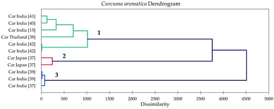 Hierarchical cluster analysis of C. aromatica essential oils clearly identified three clusters based on dissimilarity (Figure 2). Cluster 1 had a relatively high camphor concentration, represented by the C. aromatica EO sample from Thailand [38]; cluster 2 was dominated by curdione followed by 1,8-cineole, represented by two samples from Japan [37]; and cluster 3 represents samples with large concentrations of ar-curcumene and β-curcumene [15,37,39,40,41,42]. Table 7 summarizes the cluster centroids of the major components of C. aromatica rhizome oils.