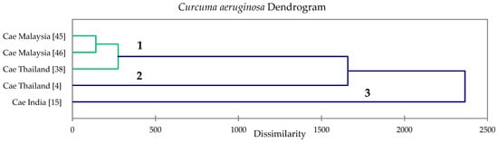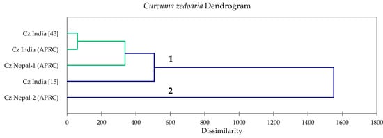 The chemical compositions of the Curcuma oils obtained from this work as well as the published literature were used in the cluster analysis. The essential oil compositions were treated as operational taxonomic units (OTUs), and the concentrations (percentages) of the major components (C. longa: α-phellandrene, p-cymene, 1,8-cineole, terpinolene, ar-curcumene, α-zingiberene, β-bisabolene, β-sesquiphellandrene, ar-turmerone (= dehydroturmerone), α-turmerone, germacrone, curlone (= β-turmerone), (6S,7R)-bisabolone, and (E)-α-atlantone; C. zedoaria: 1,8-cineole, camphor, α-copaene, β-elemene, β-caryophyllene, ar-curcumene, zingiberene, curzerene, germacrene B, β-sesquiphellandrene, curzerenone/epi-curzerenone, and germacrone; C. aromatica: α-pinene, camphene, 1,8-cineole, camphor, isoborneol, borneol, β-elemene, ar-curcumene, curzerene, β-curcumene, curzerenone, germacrone, xanthorrhizol, and curdione (= 1(10)-germacrene-5,8-dione; C. aeruginosa: camphene, β-pinene, 1,8-cineole, camphor, isoborneol, borneol, β-elemene, β-farnesene, zingiberene, curzerene, germacrene B, curzerenone, β-eudesmol, germacrone, and curcumenol) were used to determine the chemical associations between the essential oils using agglomerative hierarchical cluster (AHC) analysis using XLSTAT Premium, version 2018.5.53172 (Addinsoft, Paris, France). Dissimilarity was determined using Euclidean distance, and clustering was defined using Ward’s method.
