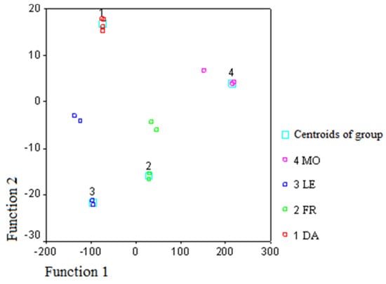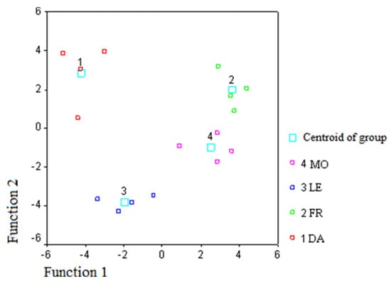 Discriminant function plot of the first two functions obtained using volatile percent composition of monovarietal EVOO samples (DA, Dolce Agogia; FR, Frantoio; LE, Leccino; MO, Moraiolo).