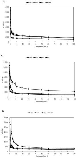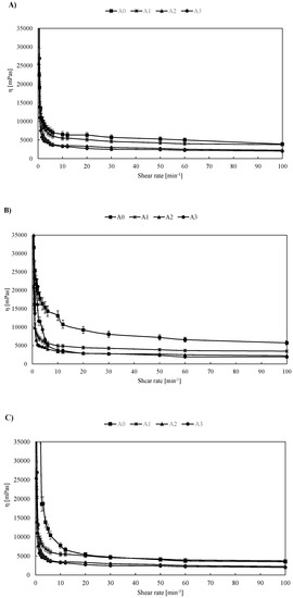 Based on the data shown in Figure 1, comparing the samples of group A, B and C, slight variations in the change in apparent viscosity at all shear rates were visible. The most pronounced changes, which were a result of the complexity of the sample composition of all groups, were visible at lower shear velocities in the interval of 0.3–10 min−1. More pronounced oscillations were observed at temperatures of 60 °C where the apparent viscosity of all samples of groups A, B and C (Figure 1B,E,G) relative to the reference samples (A0, B0 and C0) was reduced. The reduction in viscosity was most pronounced at lower shear rates, but the proportional decrease in the observed value was visible up to a maximum rate of 100 min−1. At temperatures of 80 °C (Figure 1C,F,I), in contrary to the expected influence of temperature on apparent viscosity, the viscosity of the sample sets A, B and C was similar to the values measured at 45 °C (Figure 1A,D,G), which was a result of mixture disintegration that was visible with the naked eye at higher testing temperatures (80 °C). In general, the apparent viscosities for all fillings decreased with an increasing shear rate, which is an indication of the shear thinning properties. According to [12], this behavior can be explained as a consequence of aggregate formation due to high molecular weights—at low shear rates, aggregates can remain strongly bound together, but they can also be broken at high shear rates. Furthermore, according to [13], at lower shear rates, disruption of molecular entanglements is balanced by the formation of new entanglements so that the viscosity can be kept constant. At higher shear rates, disruption of the entanglements becomes dominant and the molecules align in the direction of flow which leads to a decrease in viscosity. Furthermore, we must emphasize that for samples containing larger percentages of carob flour, the occurrence of slippage cannot be excluded due to the presence of larger and firmer carob flour particles, which can cause an increase in sample roughness and its attrition to the spindle surface.