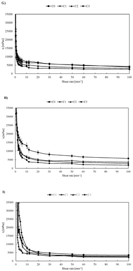 Flow curves for (A) sample set A at 45 °C; (B) sample set A at 60 °C; (C) sample set A at 80 °C, (D) sample set B for 45 °C; (E) sample set B for 60 °C, (F) sample set B at 80 °C, (G) sample set C at 45 °C, (H) sample set C at 60 °C and (I) sample set C at 80 °C. Results are expressed as mean (n = 3) ± SD (standard deviation). To allow easier comparison values, viscosity at low shear rates is omitted from the charts, and the shear rate is expressed as min−1.