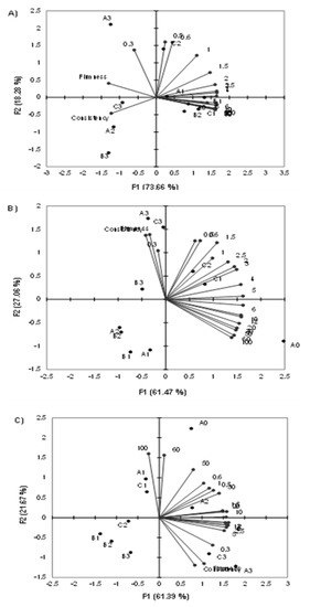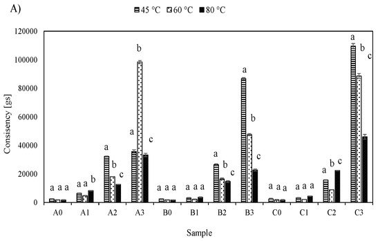 First, two factors determined by the PCA analysis accounted for 91.94% of the variability between the samples at 45 °C (Figure 3A), 82.53% at 60 °C (Figure 3B) and 83.06% at 80 °C (Figure 3C). At 45 °C, there was an evident grouping of the texture variables (consistency and firmness) on the left side of the factor plane and the viscosimeter data on the right side of the plane. Samples A3, B3 and C3 were also grouped on the left side of the plane, which means that they were separated from the rest due to their high consistency and firmness values. Samples with lower amounts of carob flour were all grouped on the right side of the factor plane and were separated based on their viscosity values at higher shear rates (5–100 min−1) (Figure 2A).