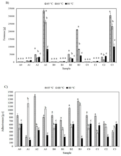 Textural properties of cocoa and carob-based pastry fillings: (A) consistency, (B) firmness and (C) adhesiveness (results are expressed as mean values of 3 measurements ± SD). Different letters above the column for the same sample analyzed at different temperatures represent significant differences at p < 0.01.
