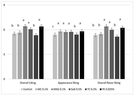 The consumer tests were carried out in partitioned booths under incandescent light at ~21 °C. About 60 mL of each chicken soup sample was served at ~50 ± 2 °C in a 118-mL Styrofoam cup. The samples were coded with three-digit random numbers and served in a sequential monadic order based on a completely randomized design. Unsalted Saltine crackers and distilled water were served as palate cleansers in-between samples. A nine-point hedonic scale (1—dislike extremely; 5—neither like nor dislike; 9—like extremely) was used for liking questions and a seven-point Just-about-right (JAR) scale (1—too weak; 4—JAR; 7—too strong) was used for color, overall flavor, salty, and savory (umami) tastes intensity questions.
