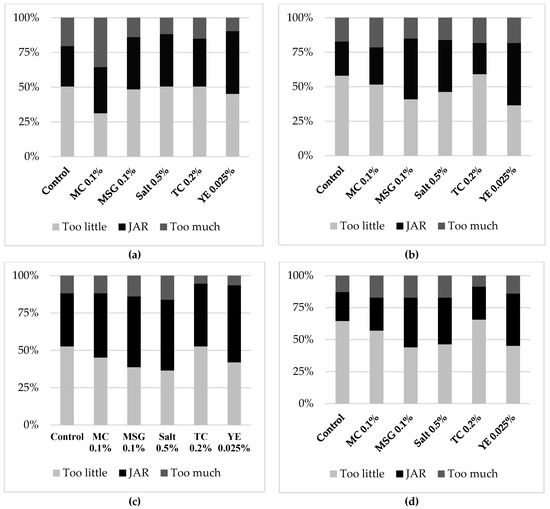 Consumers also evaluated the optimal intensity of color, overall flavor, salty, and savory (umami) tastes using seven-point JAR scale (Figure 2a–d). Samples that were liked more by consumers also got a larger percentage for JAR category (4 on the scale). Similar distribution pattern of JAR data was observed among overall flavor, salty, and savory tastes of six chicken soups. YE 0.025%, MSG 0.1%, and Salt 0.5% consistently had lesser “too low” and more JAR scores than other samples for these three attributes. The pattern for color JAR was slightly different because the scores for MC 0.1% were almost evenly distributed among three categories. Eighty percent of JAR scores is considered as a common benchmark by some product developers [22]. In this study, most of the JAR scores were less than 50%, which was far below the benchmark of 80%. One-sample t-test was also conducted to compare individual product’s mean JAR intensity versus the center point’s value on the scale (4) for each attribute. A significantly lower value was detected for all the tests, indicating the mean intensity was very much skewed below the appropriate level.