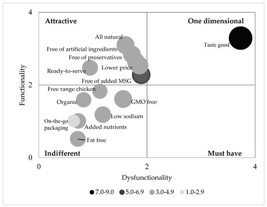 The self-stated importance rating was firstly compared among all attributes using ANOVA and then projected on to the Kano plot with the size of individual attributes proportional to its importance. “Taste good” was the most important attribute to consumers with a score of 8.1 on a 9-point scale, which was significantly higher (P < 0.05) than all the other attributes (data not presented). “Free of added MSG” was the second important attribute of chicken soup products. Consumer perceived no difference in the importance of “free of added MSG”, “all natural”, “lower price”, “GMO free”, “free of artificial ingredients” and “free of preservatives.” But only “free of added MSG” obtained a score of 5 which was the benchmark for important attributes on a 9-point scale. Therefore, “Free of added MSG” was the only attractive feature that consumers felt important. According to FDA, foods with any ingredient that naturally contains MSG cannot claim “No MSG” or “No added MSG” on their packaging [30]. However, there are some manufacturers still claiming “No (added) MSG” on either packaging, website, or other sources for soup products enhanced by MSG substitutes that naturally contain MSG. More clear definition and stronger regulation may be required to clarify MSG-related claims. According to Figure 3, the self-stated importance generally decreased in the order of one-dimensional > attractive > indifferent. However, GMO-free, an indifferent feature, obtained an importance score that was statistically same to most of attractive attributes. “Ready-to-serve” which was attractive to consumers grouped with other indifferent attributes from viewpoint of self-stated importance.