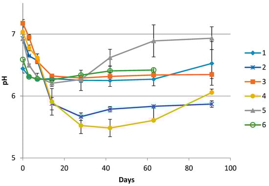 pH values in brine collected from the middle layer in the containers from the individual producers (1–6) during the rakfisk ripening process. (Day 63 was the last sampling day from Producer 3). Error bars represents the standard deviation of the triplicate biological replicates.