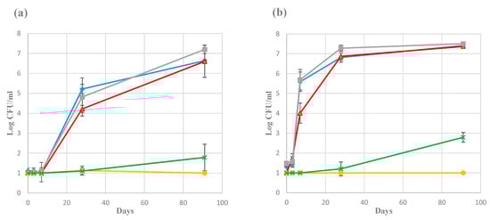 Microbial growth in brine during rakfisk ripening from the first year from Producer 1 (a) and Producer 3 (b). Error bars represents the standard deviation of the triplicate biological replicates. The detection limit was 20 CFU/mL. 10 CFU/mL were used as default number from the plates where no growth could be detected. ■ (grey), BA; ♦ (blue), PCA; ▲ (red), MRS; x (green), VRBG; ● (yellow), DRBC (Dichloran Rose Bengal Chloramphenicol).