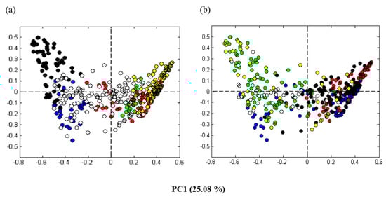 Score plots of the principal component analysis (PCA) for the pre-processed aligned partial 16S rRNA gene spectra. Rakfisk brine samples were collected from the six producers throughout the ripening period during two years (see Table 1). (a) The data points visualized according to the bacterial taxa corresponding to the dominating MCR (multivariate curve resolution) component of each sample; blue: Gammaproteobacteria (component 1), red: Bacillales (component 2), green: Lactobacillales (component 3), black: Psychrobacter (component 4), yellow: Lactobacillus (component 5), and white: none of the components were above 50%. (b) The data points visualized according to the six different rakfisk producers; 1: green, 2: blue, 3: black, 4: red, 5: yellow, 6: white.