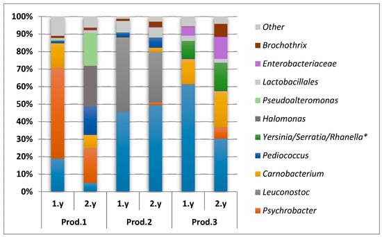 Dominating microbiota (all taxa above 1% across all samples) obtained from Illumina (MiSeq) of brine samples collected day 91 from the first and the second year (1.y and 2.y, respectively) from the Producers (Prod.) 1, 2, and 3. * Not possible to distinguish between these genera in the analysis.