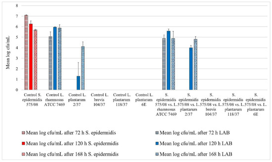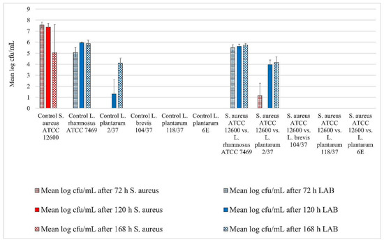 Biofilm challenge: Staphylococcus aureus ATCC 12,600 vs. lactic acid bacteria (LAB). Cfu/mL values are shown transformed by log (± standard error of the mean).
