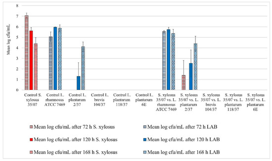 Biofilm challenge: S. xylosus (35/07) vs. LAB. Cfu/mL values are shown transformed by log (± standard error of the mean).